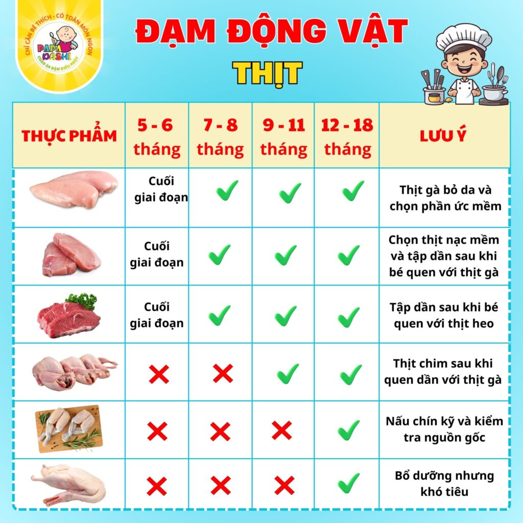 👉 Ví dụ: Xay nhuyễn thịt khi mới bắt đầu và chuyển dần sang luộc hoặc hầm mềm khi bé đã cứng cáp hơn.